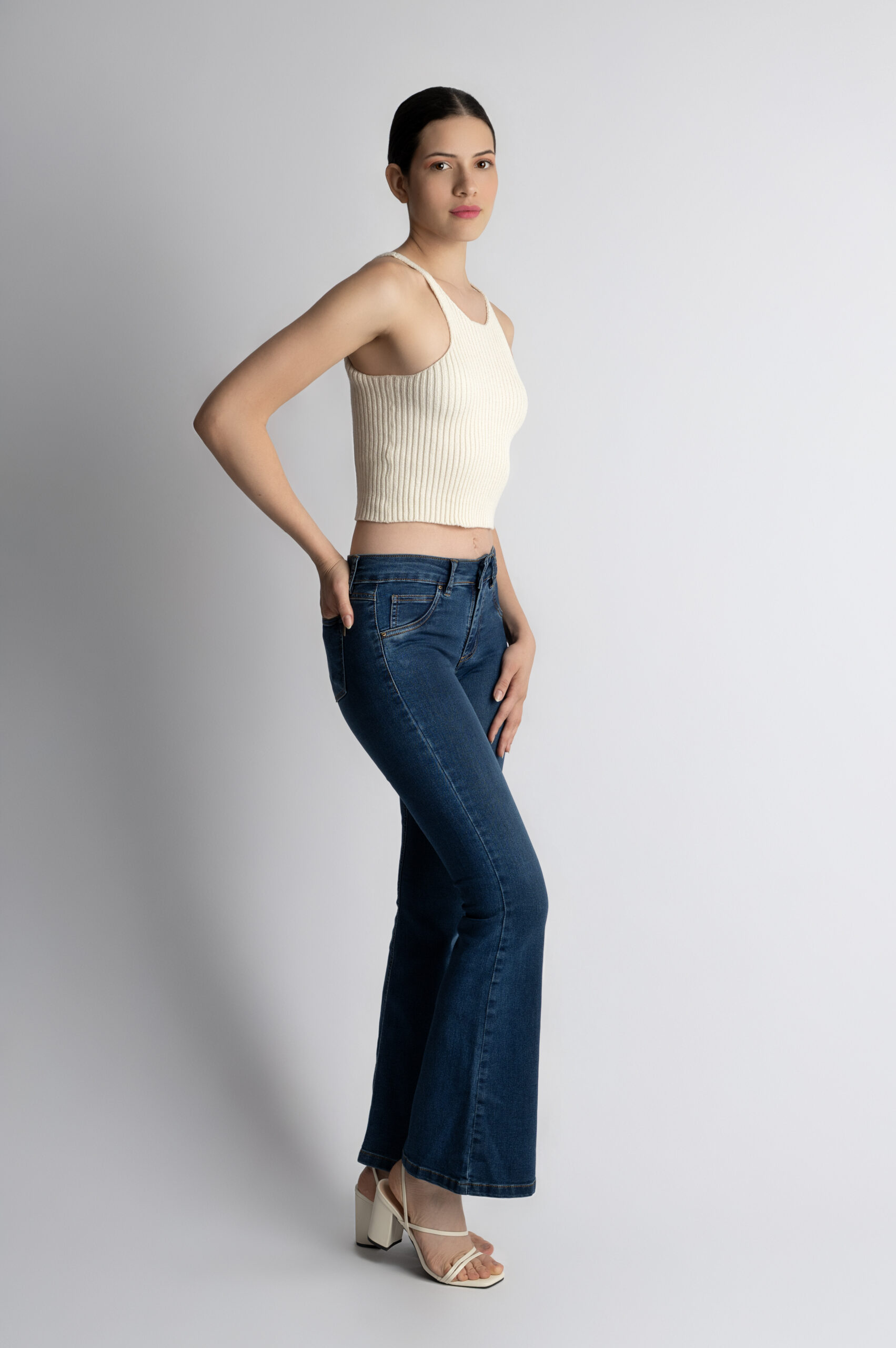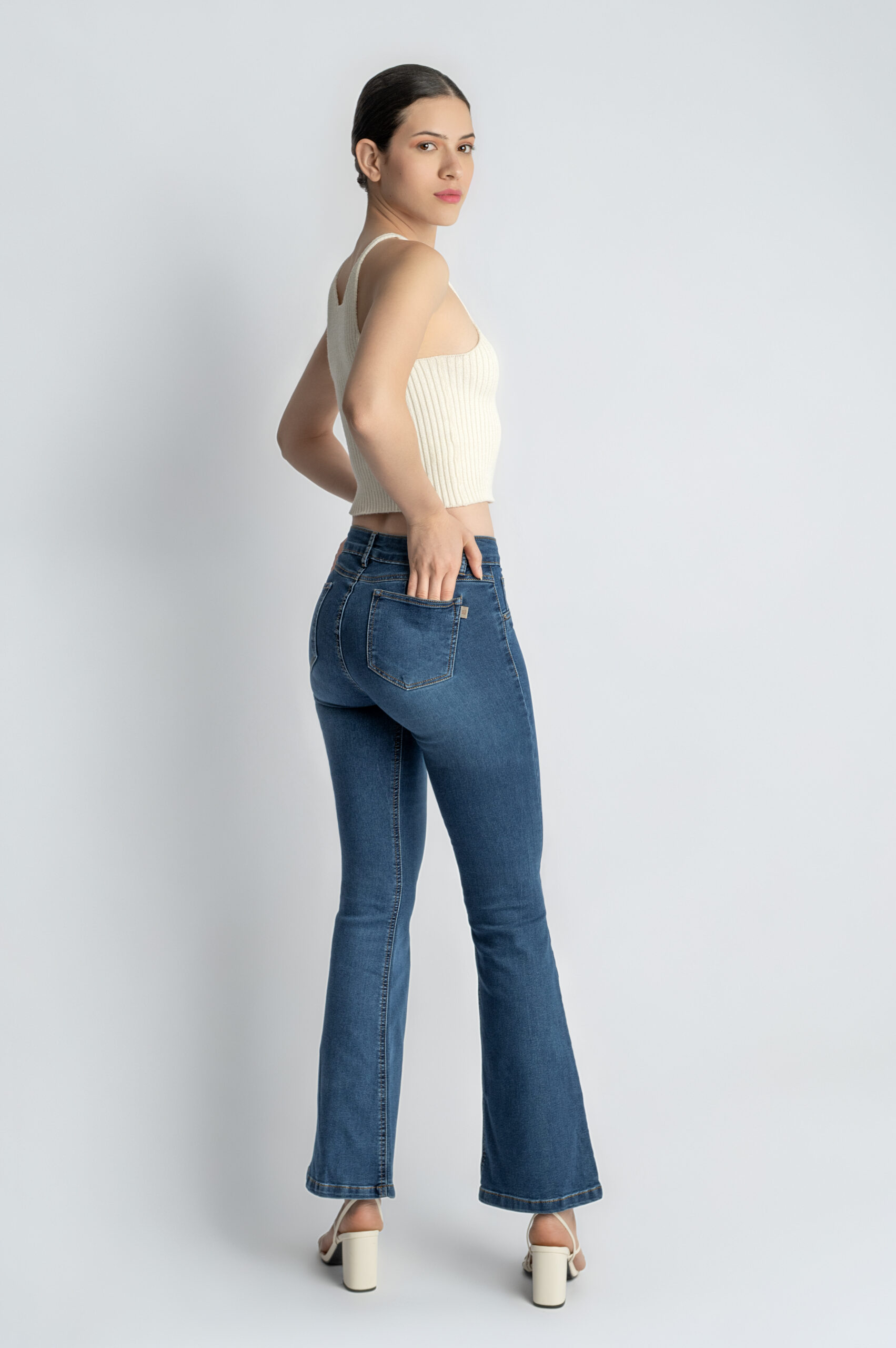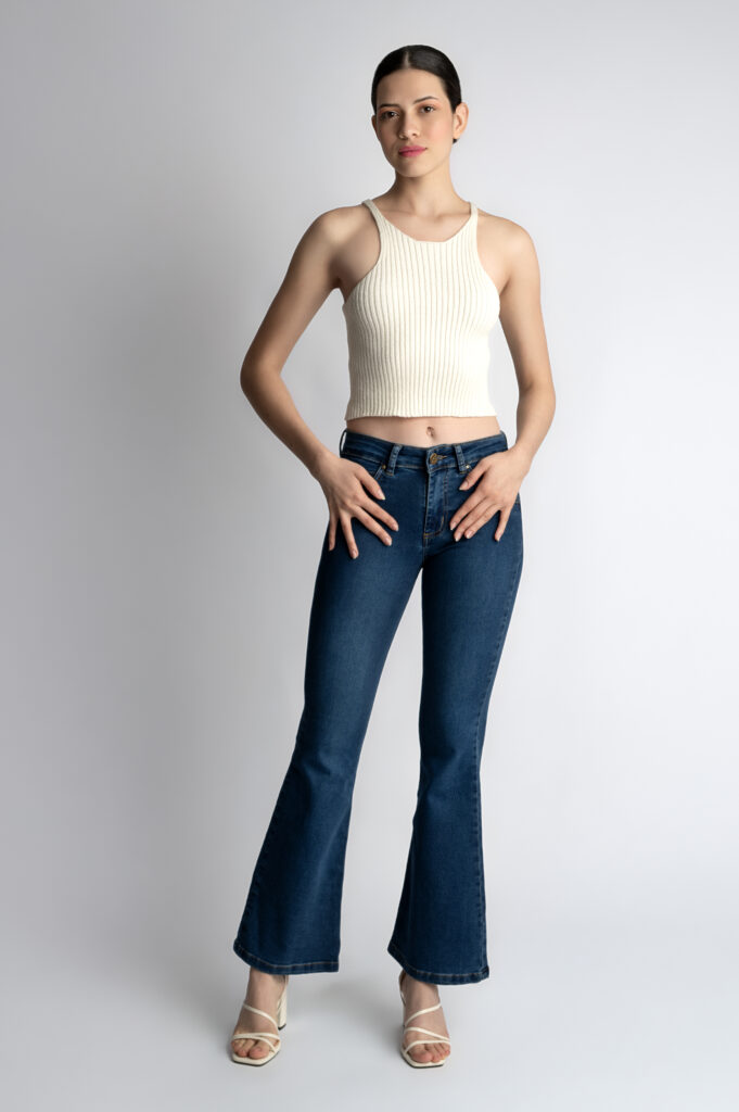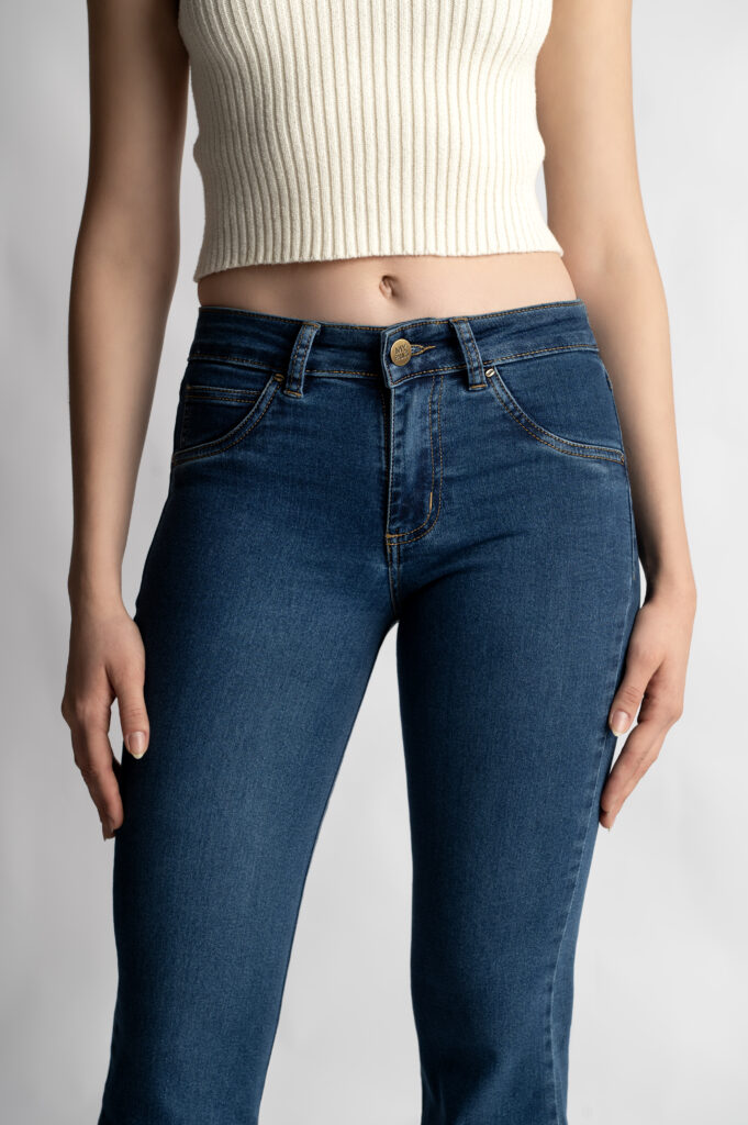 A timeless flare design with a mid-rise waist that hugs the body perfectly, offering superb shaping and naturally enhancing the silhouette. Its deep blue hue adds versatility, making it an ideal piece to pair with a wide range of styles and for various occasions.