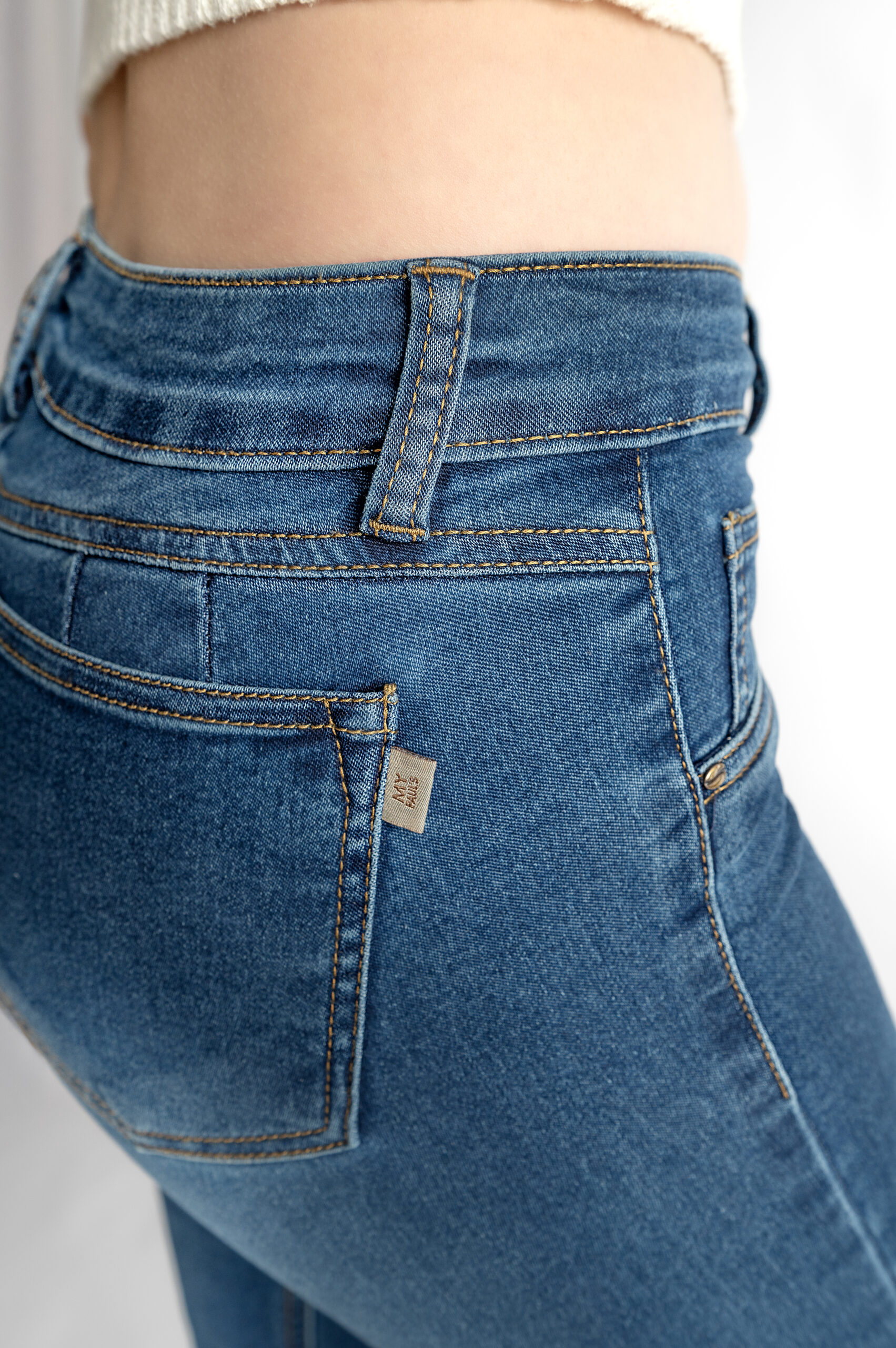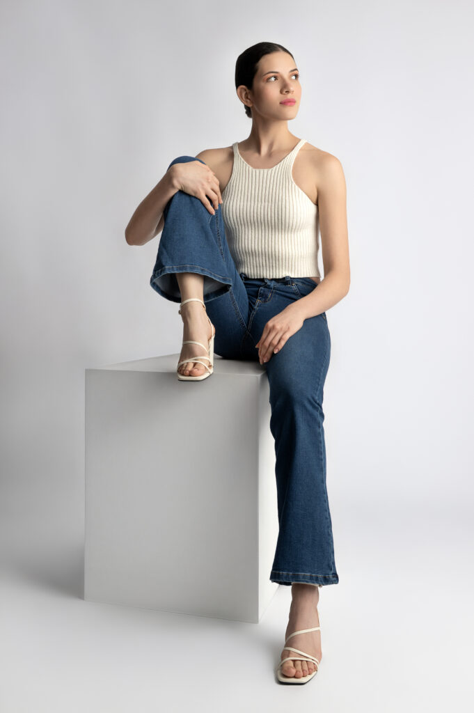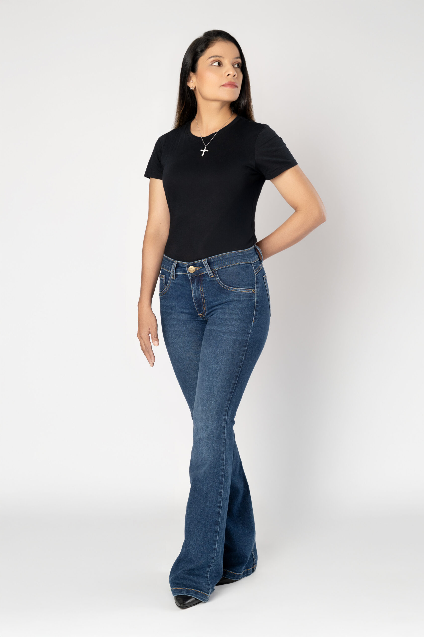 A timeless flare design with a mid-rise waist that hugs the body perfectly, offering superb shaping and naturally enhancing the silhouette. Its deep blue hue adds versatility, making it an ideal piece to pair with a wide range of styles and for various occasions.