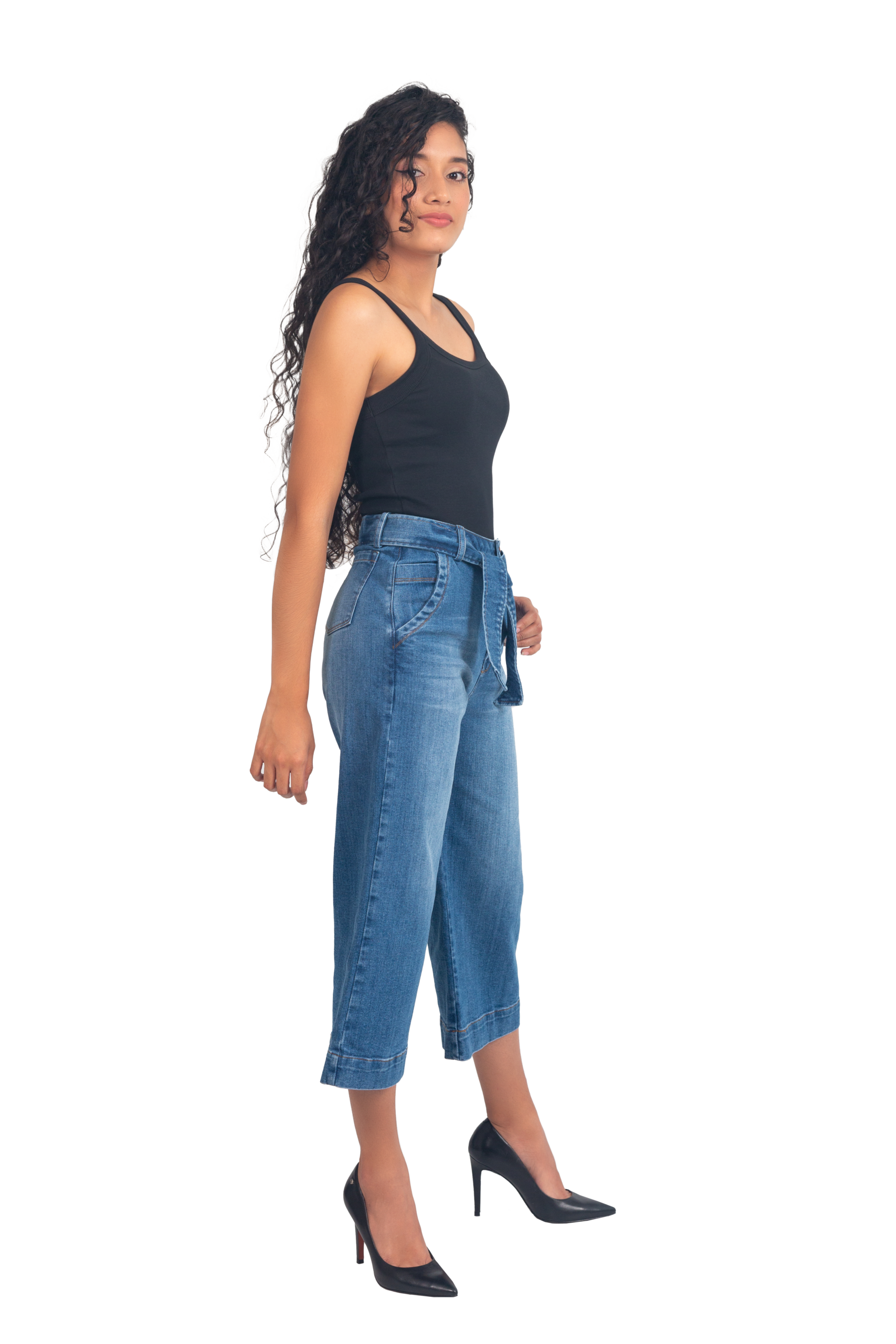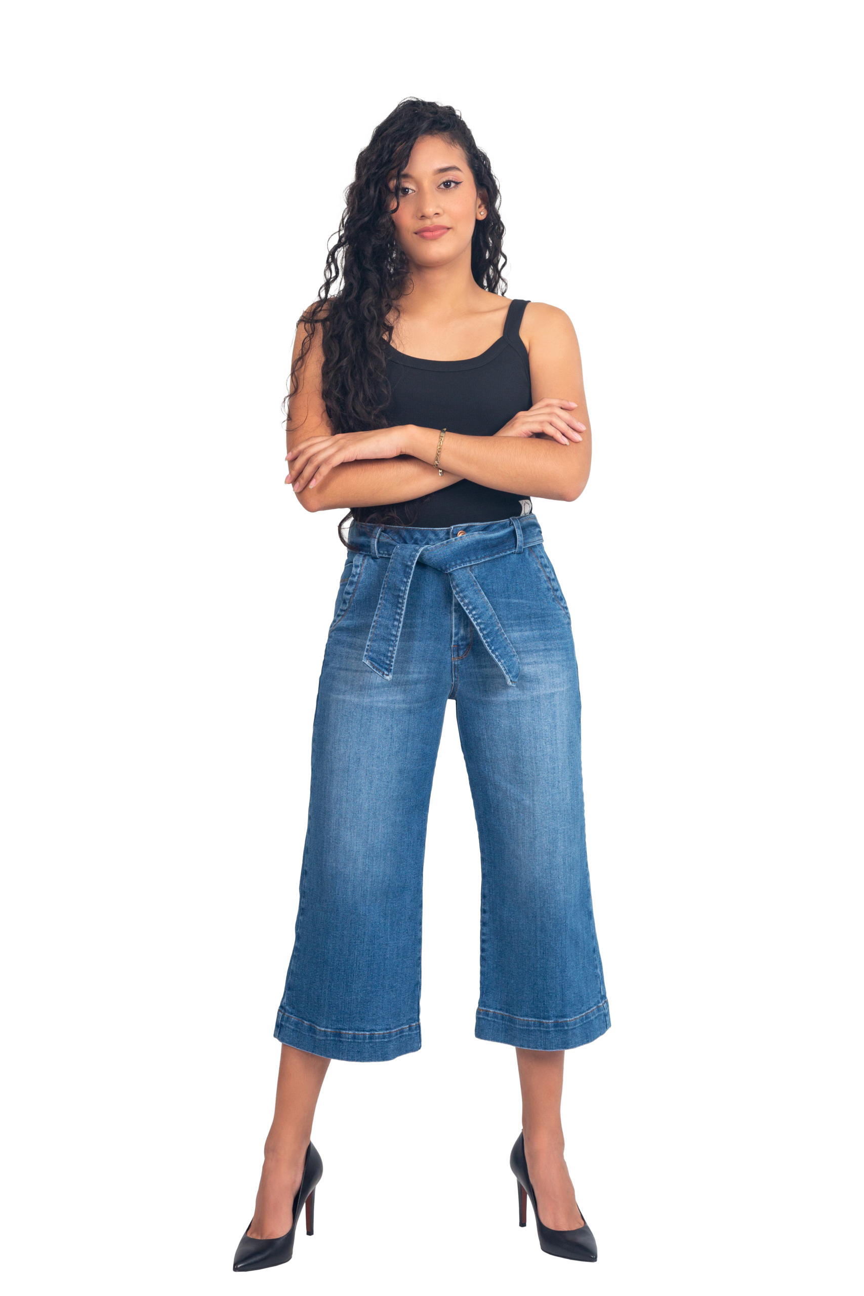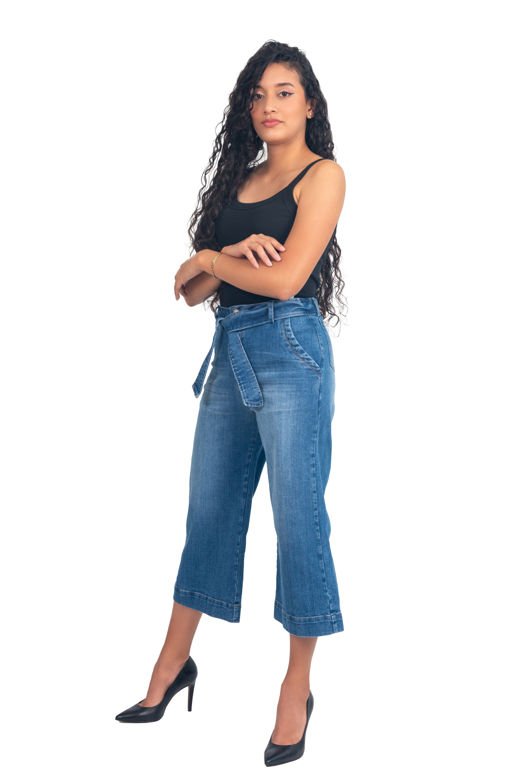 Culotte-style jean with high waist, wide cut, and mid-calf length – ideal to highlight the figure with a modern touch. It features a belt made of the same fabric to accentuate the waist and a medium blue wash that makes it easy to pair. Perfect for a fresh and comfortable look.