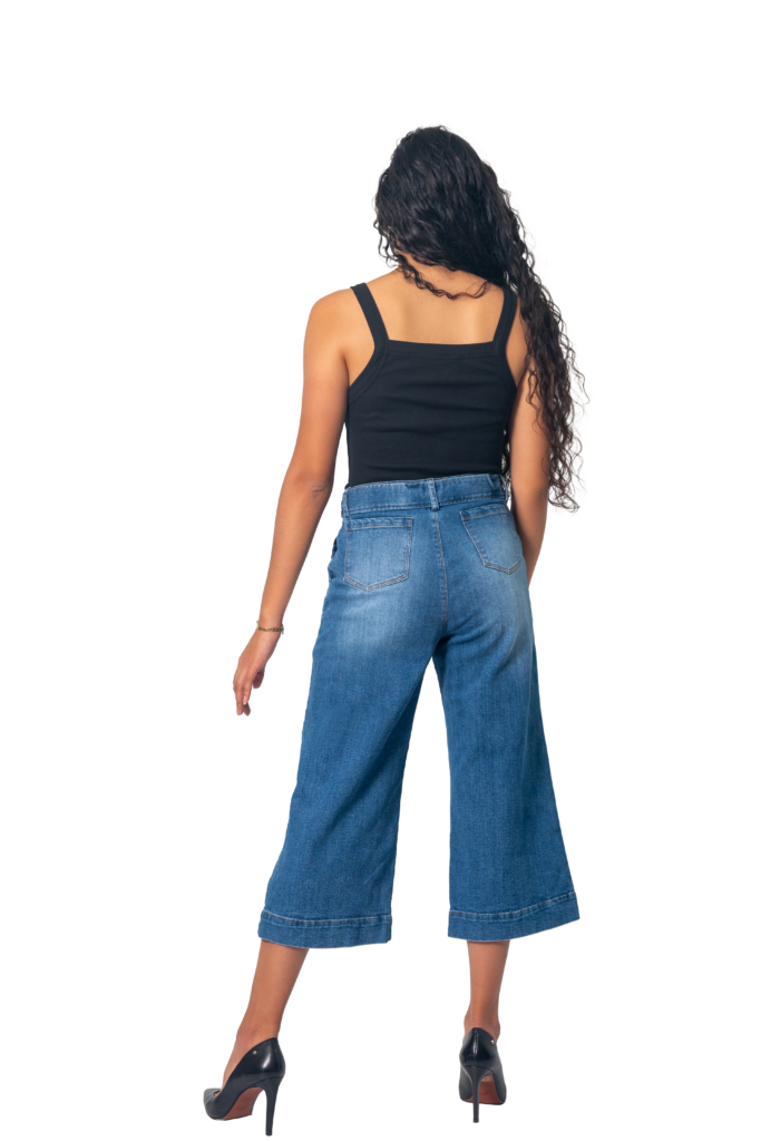 Culotte – Jean mit hoher Bund Höhe, weitem Schnitt und wadenlangem Bein – ideal, um die Figur mit einem modernen Touch zu betonen. Mit einem Gürtel aus demselben Stoff, der die Taille hervorhebt, und einem mittelblauen Waschung, die sich leicht kombinieren lässt. Perfekt für einen frischen und bequemen Look. 👌